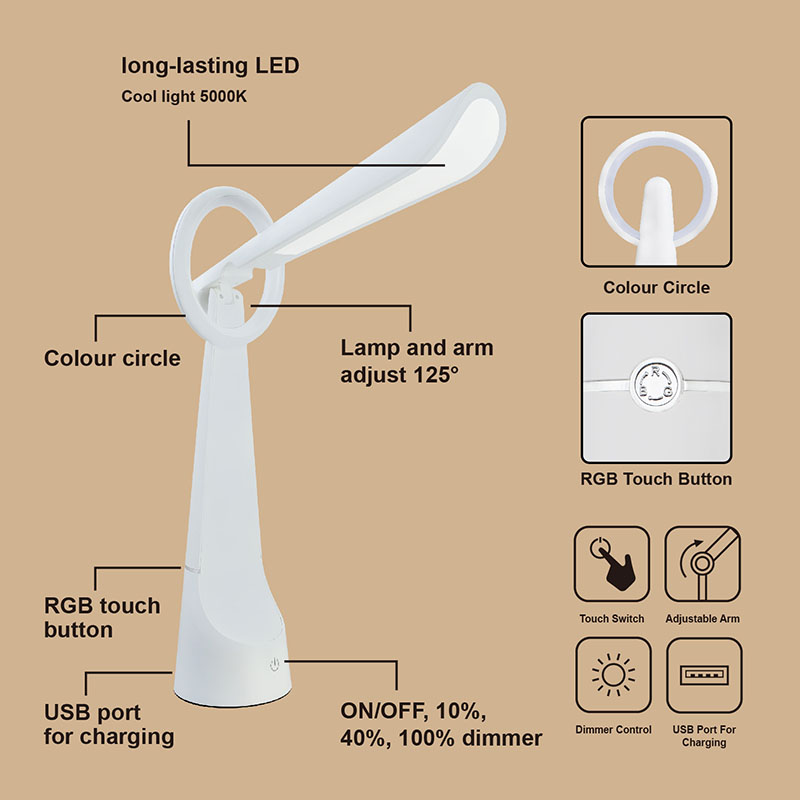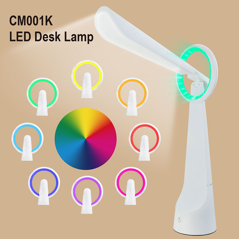 Dekorasi rgb dipimpin lampu meja lampu bisa 3 dimmer bali ing awak produk. Kepala lampu sing dipimpin bisa mbukak maksimal 125 °.