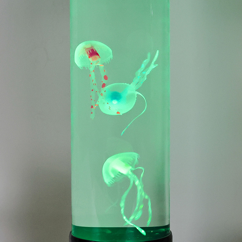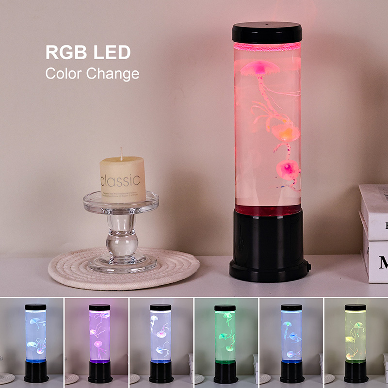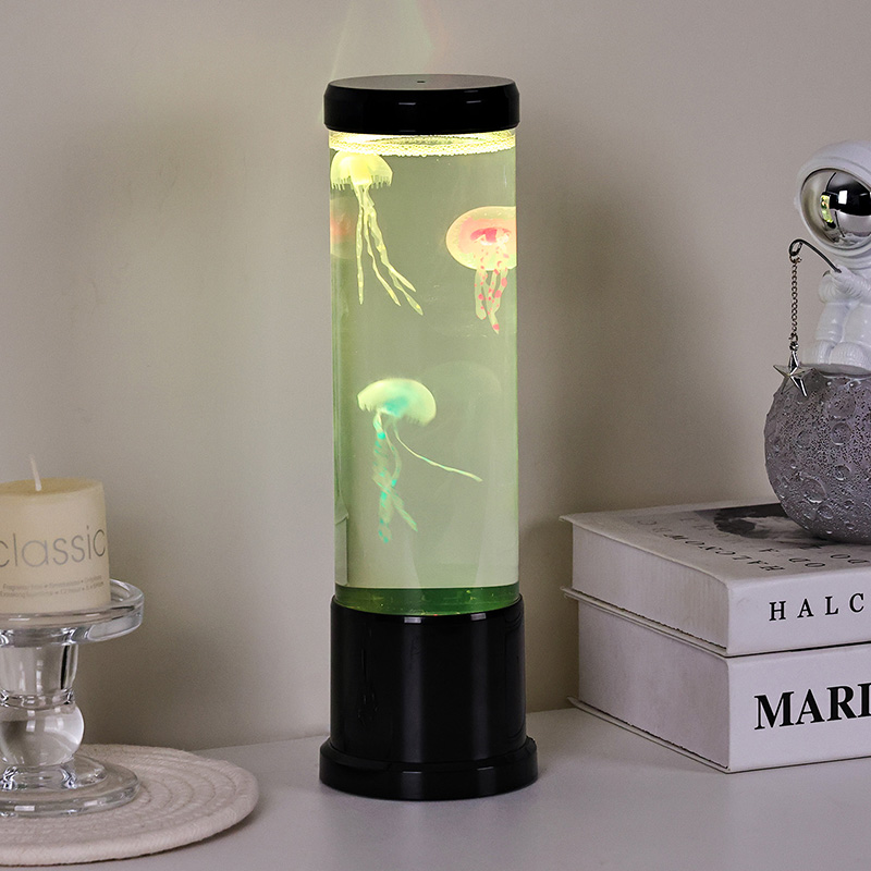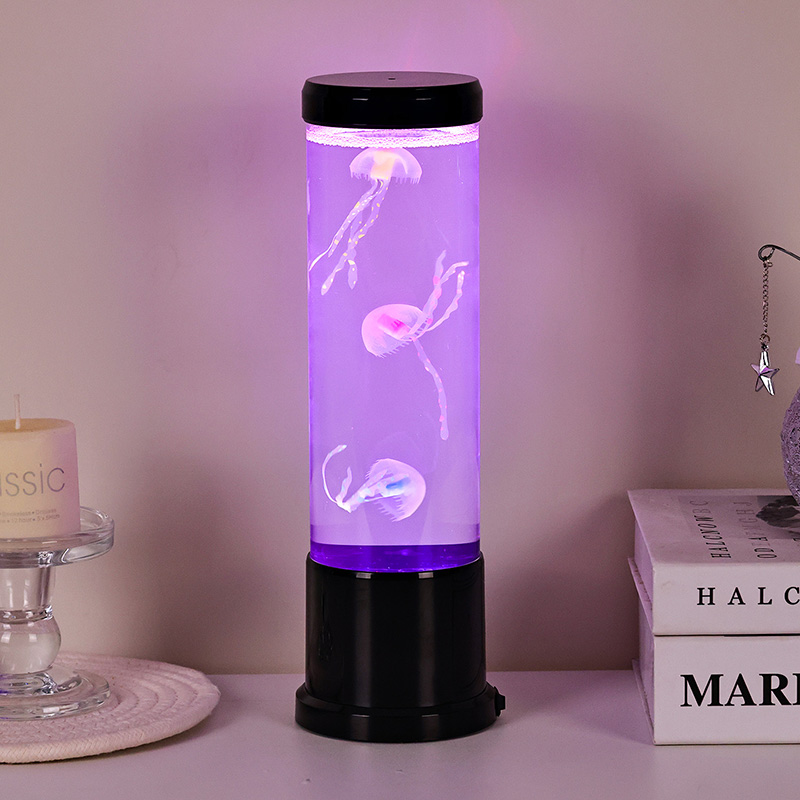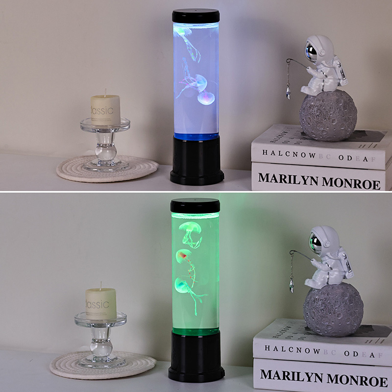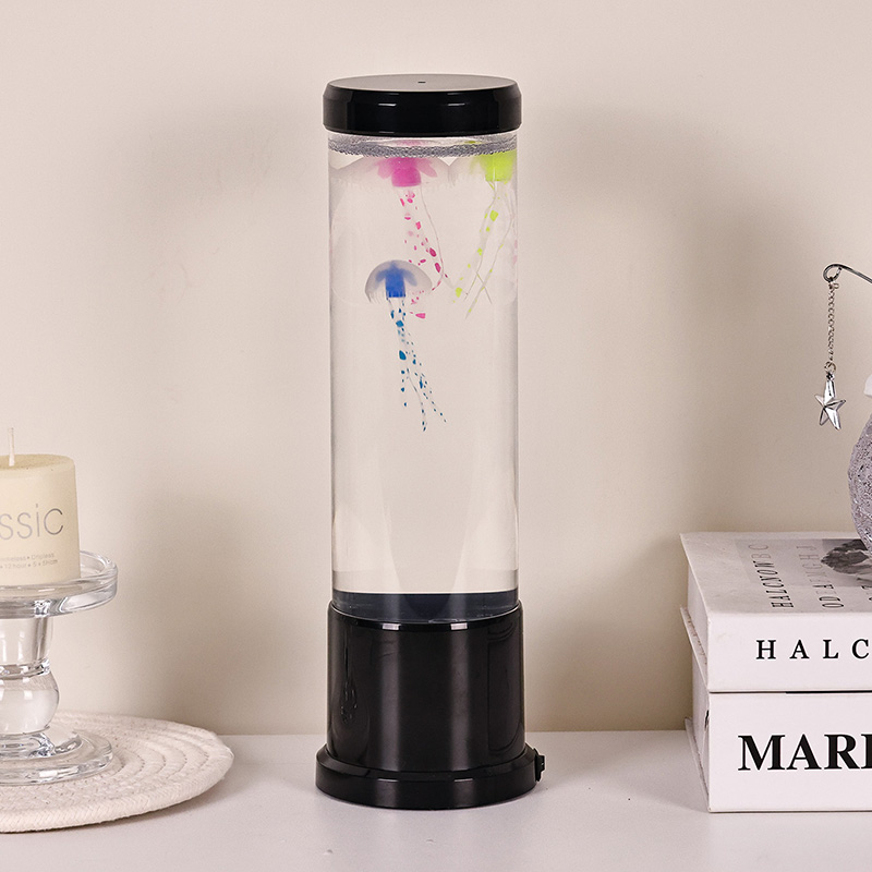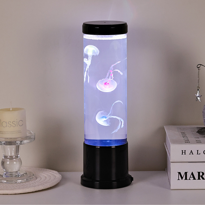Desain Elegant Meets Nature-Inspired Lampu ubur-ubur ukuran dhuwur sing dipimpin nganggo silinder ramping sing digawe saka akrilik transparan sing berkualitas tinggi sing ngidini visibilitas ubur-ubur sing apik banget. Dibungkus ing medium cairan biru alus, telung ubur-ubur sing kaya urip alon-alon ngambang lan pulsa, awak tembus dipadhangi lampu LED sing dinamis lan warna-warni. Cemlorot sing lembut ngobahake spektrum warna sing nyenengake - saka biru laut lan ungu sing jero dadi warna pink lan ijo sing lembut - niru bioluminesensi sing ditemokake ing lingkungan segara sing nyata. Sisih ndhuwur lan dhasar lampu rampung ing plastik ireng nggilap, menehi tampilan modern lan minimalis sing nglengkapi gaya dekorasi apa wae.