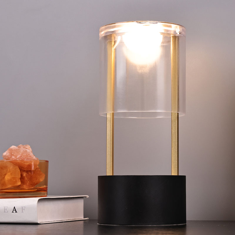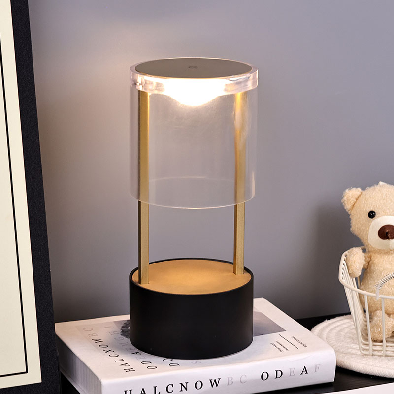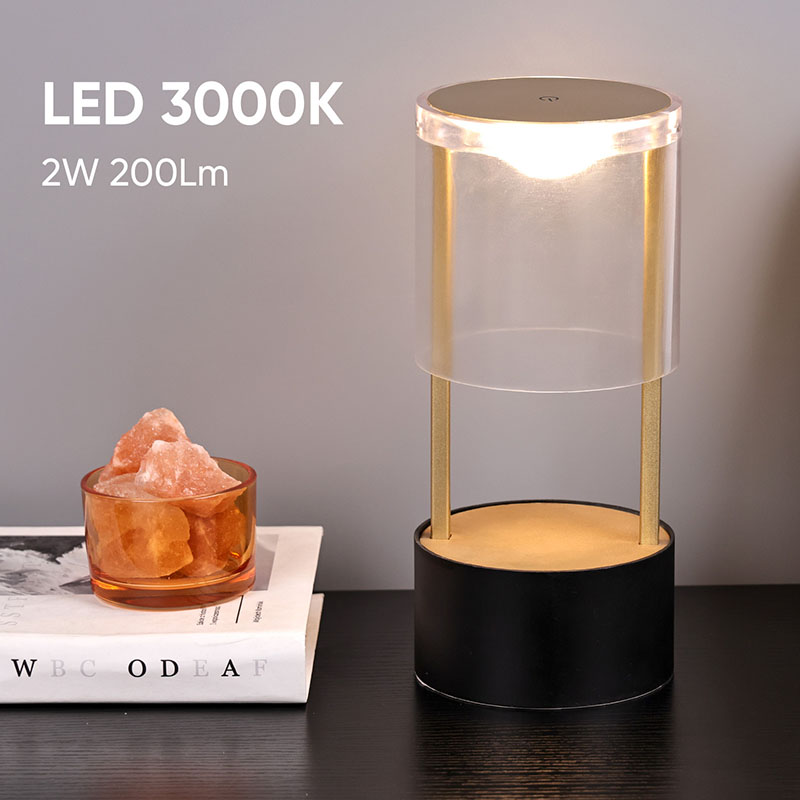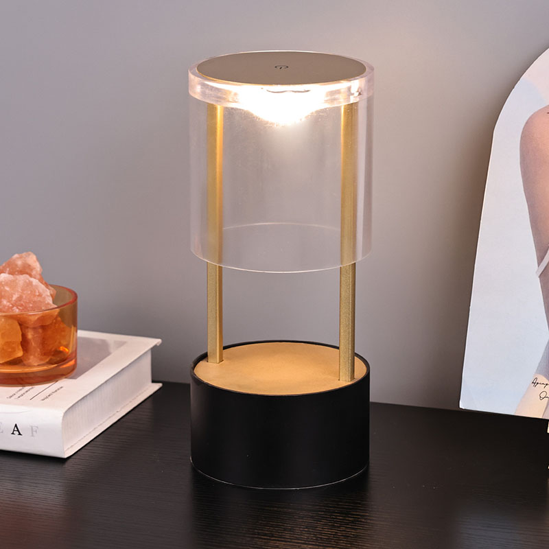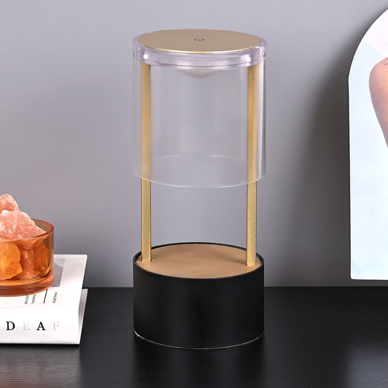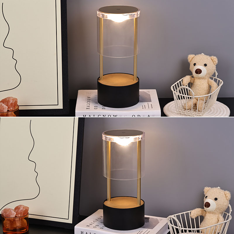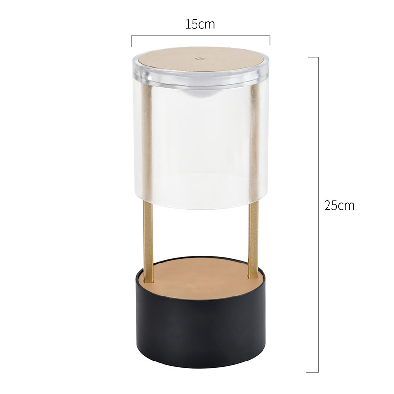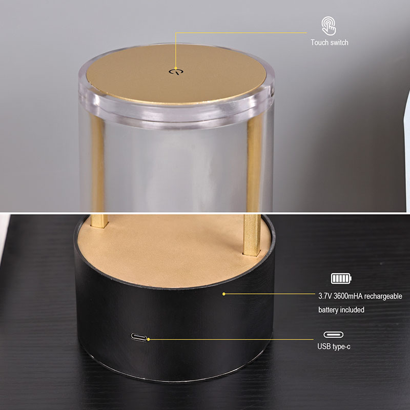 Ndhuwur Lampu Meja Cilik Gaya Lantern yaiku saklar lampu sensitif tutul, kanthi sirah pangisi daya sing bisa diisi ulang tipe-c ing sisih ngisor. Sisih ndhuwur kasusun saka tutup akrilik transparan, lan sisih ngisor minangka basis logam. Struktur bunder sakabèhé ngidini cahya sing bisa dipindhah