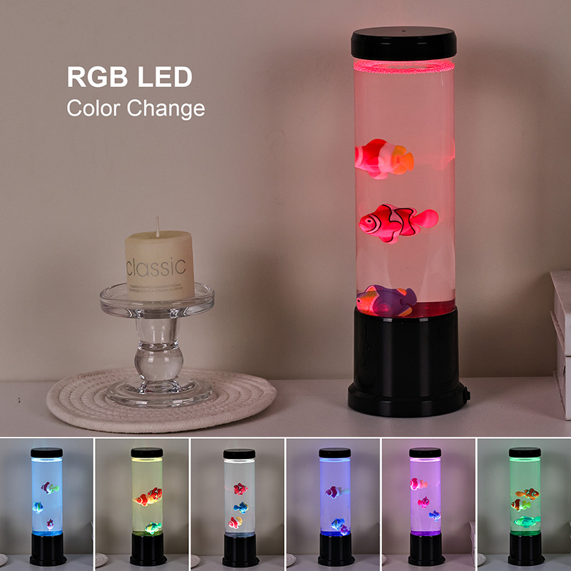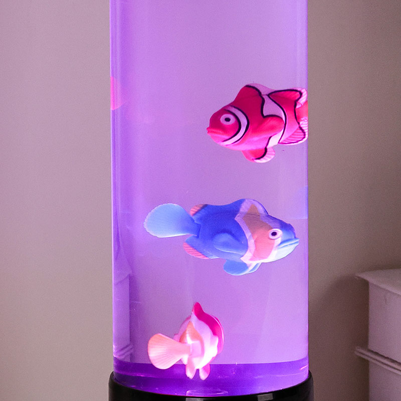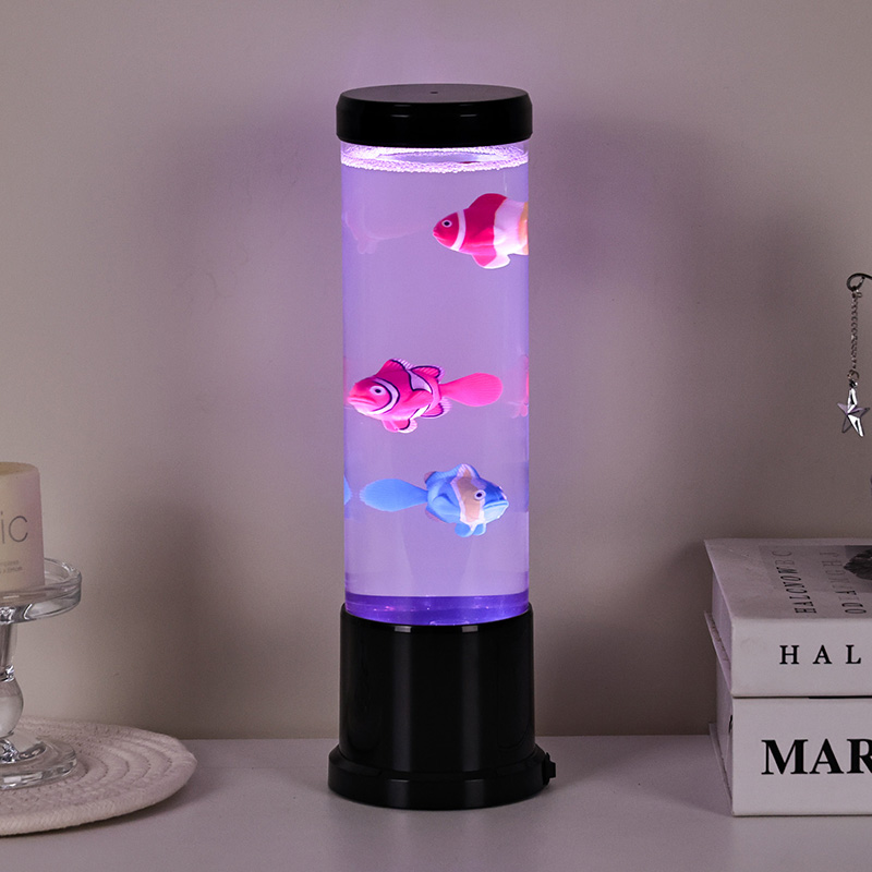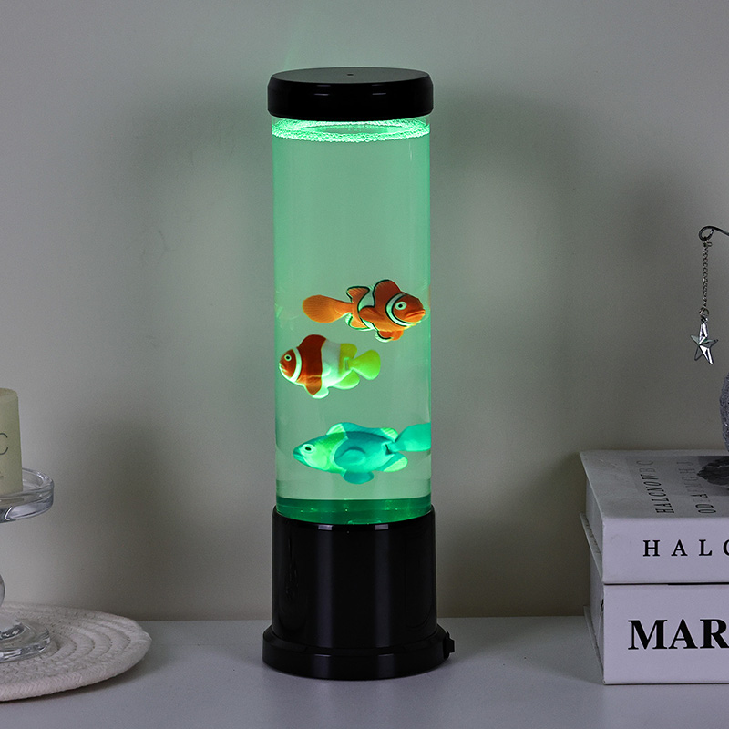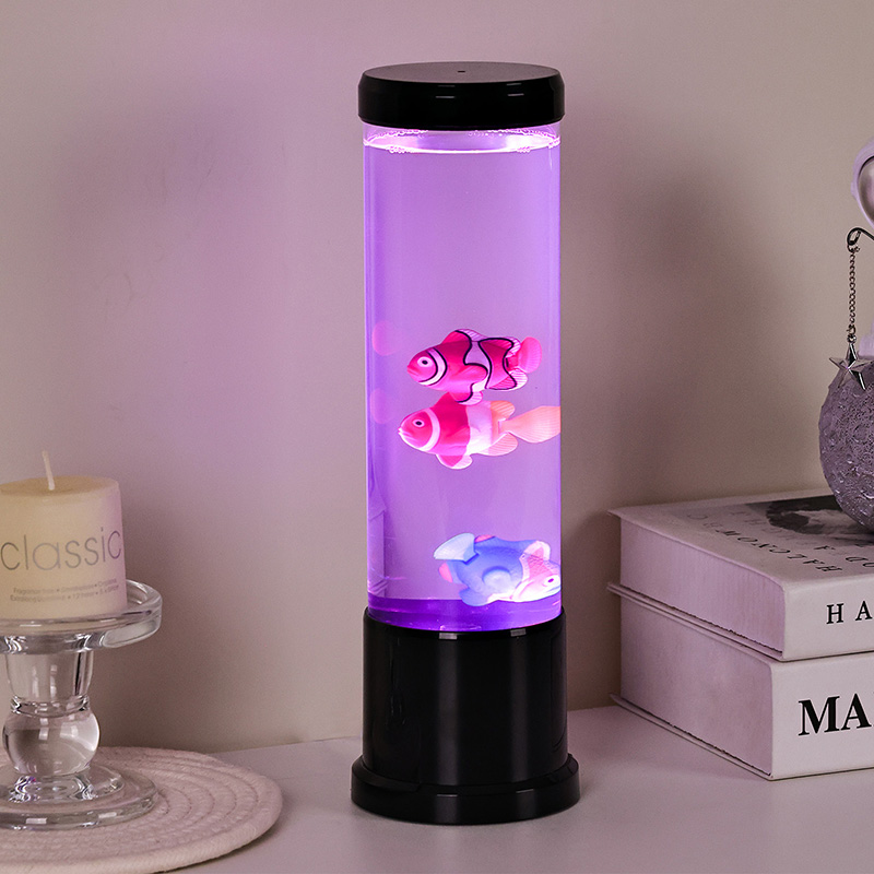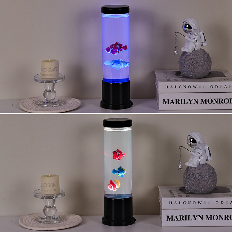 Ing tengah lampu iki ana simulasi tank iwak sing digawe kanthi ati-ati. Ing kolom sing cetha, sampeyan bakal nemokake tokoh-tokoh iwak sing ngambang kanthi rinci-kayata clownfish sing sregep lan spesies tropis liyane-sing alon-alon obah lan nglangi liwat cairan kaya banyu. Penambahan ubur-ubur sing mencorong nambah ilusi ing jero banyu sing magis, pulsing alon-alon kanthi cahya ethereal. Kombinasi gerakan lan warna nggawe pemandangan dinamis sing narik perhatian lan nggawa katentreman ing lingkungan sampeyan.