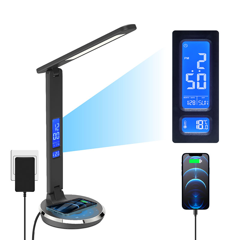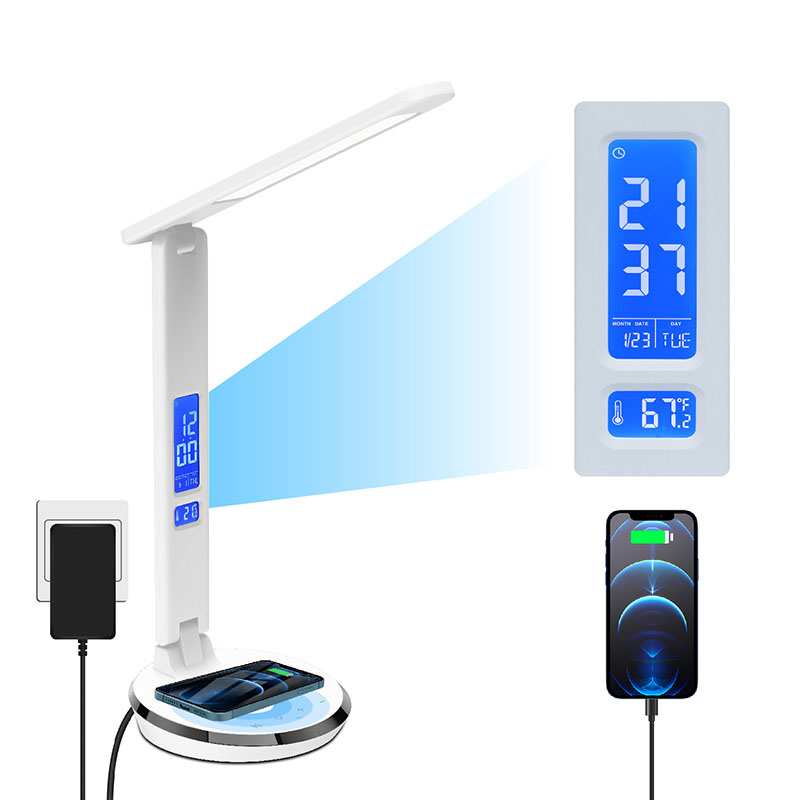Ana layar LCD kanthi tampilan Suhu, Wektu, Jam weker, Tanggalan langgeng karo tombol contorl awak mburi. Lan ana port pangisi daya usb ing mburi lampu meja.