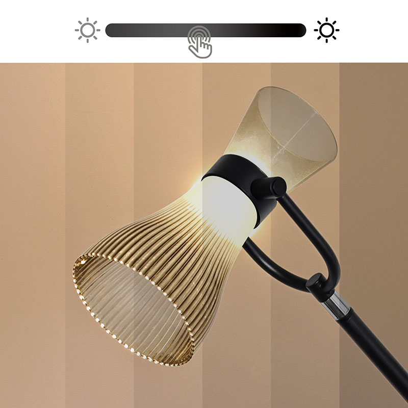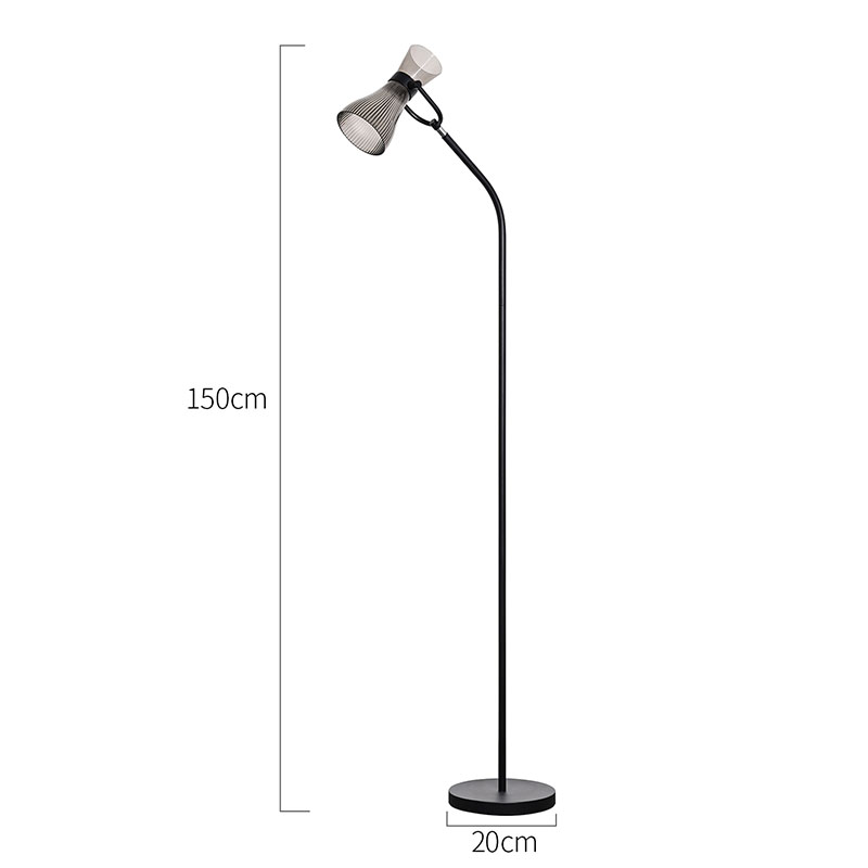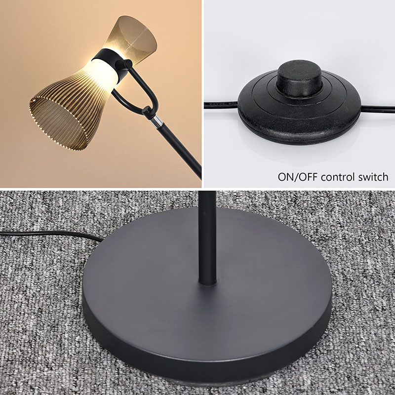 Ngalih dimming kakiLampu lantai sing dipimpin modern kanthi teduh kaca nganggo konsep desain minimalis, kanthi bentuk sakabèhé sing prasaja nanging apik gayane. Dhuwur 150 sentimeter lan diameter dhasar 20 sentimeter menehi ngarsane cukup tanpa njupuk akeh papan. Batang lan dhasar logam wis dipoles kanthi alus, kanthi permukaan sing alus lan alus,