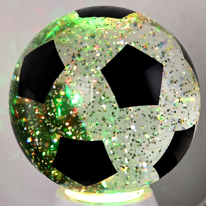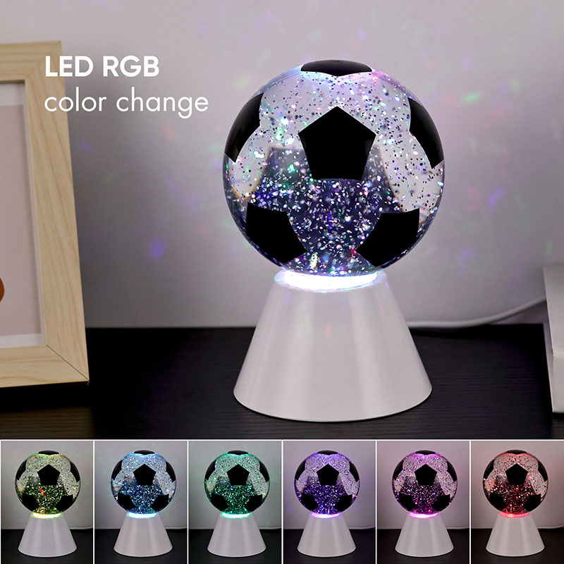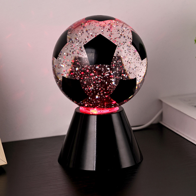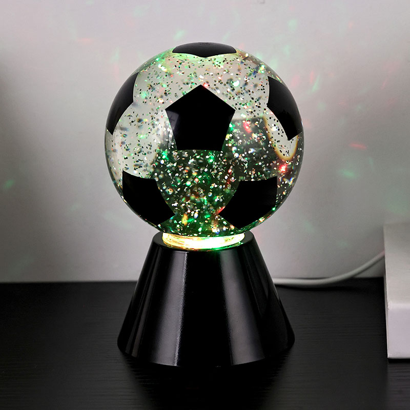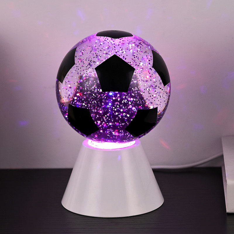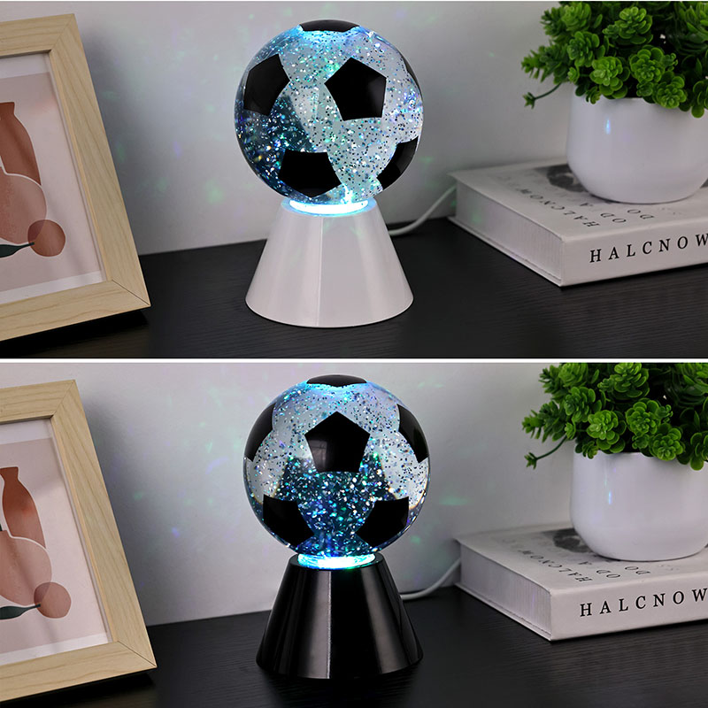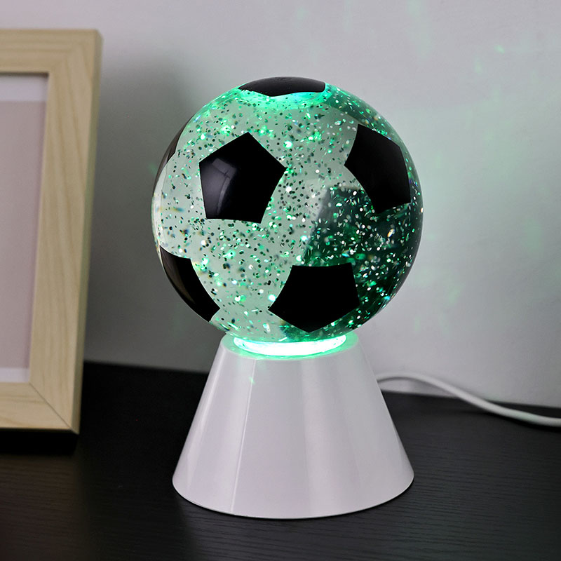 Putih + LED ngganti wernaLampu hadiah bunder kasusun saka kaca ndhuwur lan dhasar plastik. Lumahing kaca dicithak kanthi pola bal-balan, sing bisa dicithak ing macem-macem werna. Fitur utama Night Light karo Football Shade yaiku ana cairan ing njero bal, sing ngemot manik-manik. Sawise ngalih diuripake, dibangun ing motor cilik wiwit digunakake, lan Cairan ing kaca bakal pindhah ora duwe aturan baku. Ing wektu sing padha, cahya ngisor cahya wengi kanthi bal-balan Shade wiwit ganti, sing apik banget. Night Light with Football Shade utamane digunakake kanggo dekorasi interior, ing kamar, ruang tamu, kamar hotel, lan papan liyane, Produk kasebut uga dilengkapi ngisi daya USB lan bisa nggunakake baterei 3AAA.