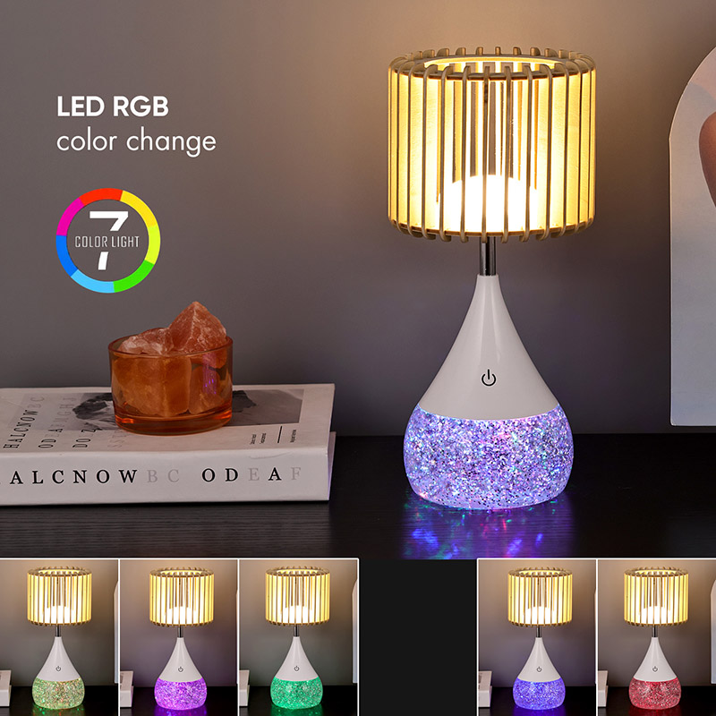Desain:** Kap lampu slat kayu sing unik, dhasar sing ngganti warna RGB
