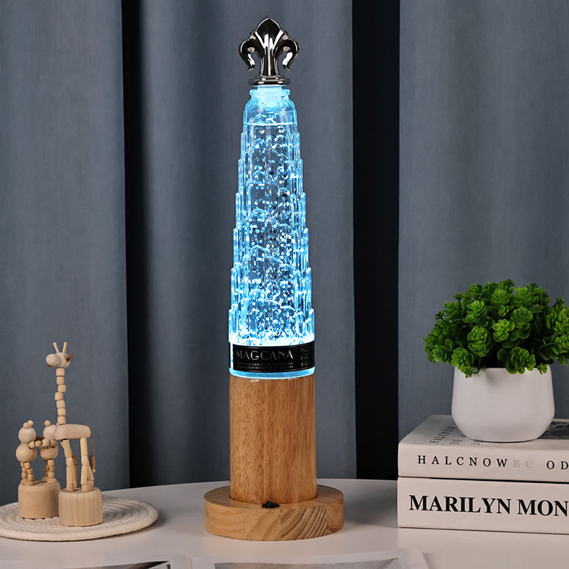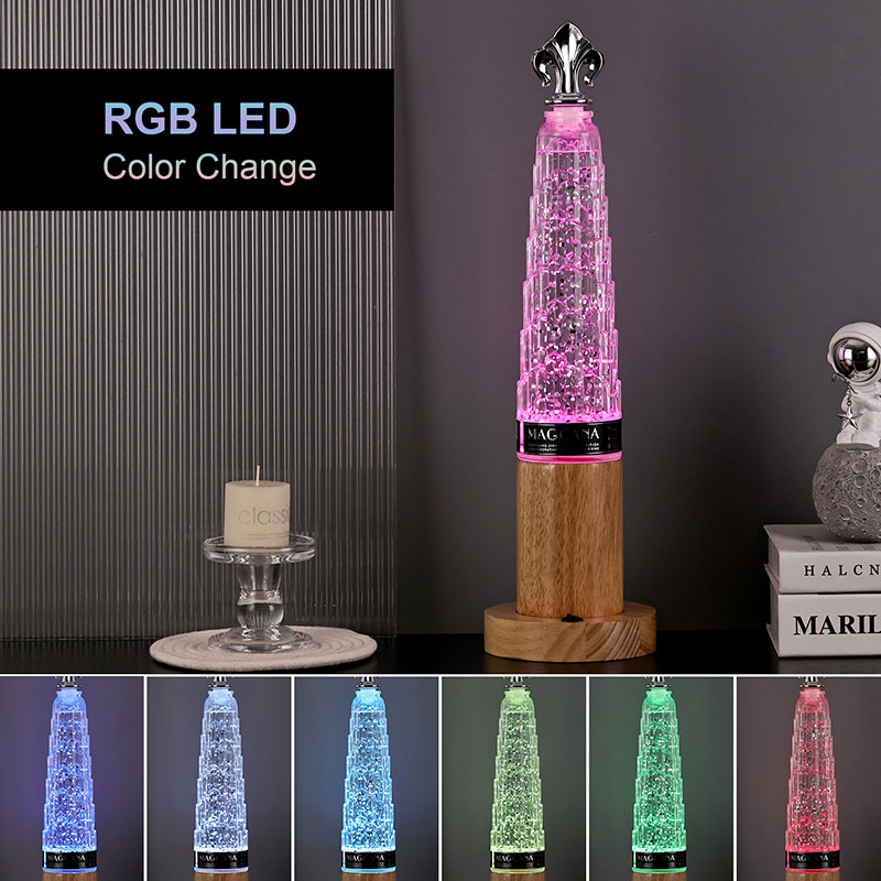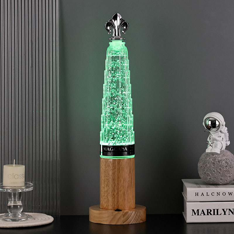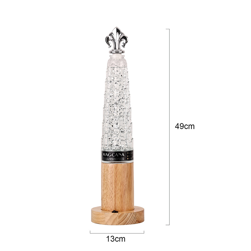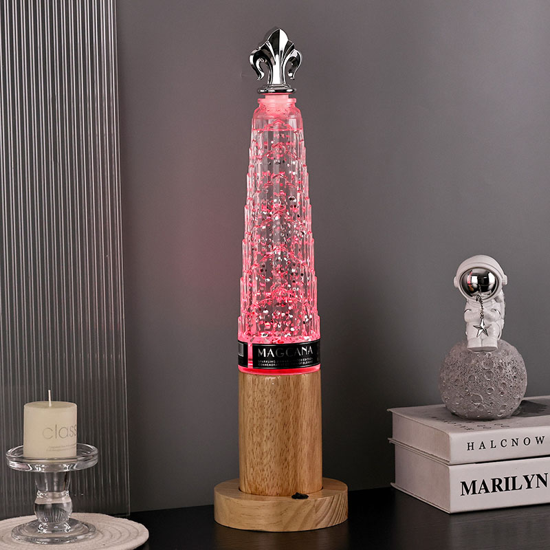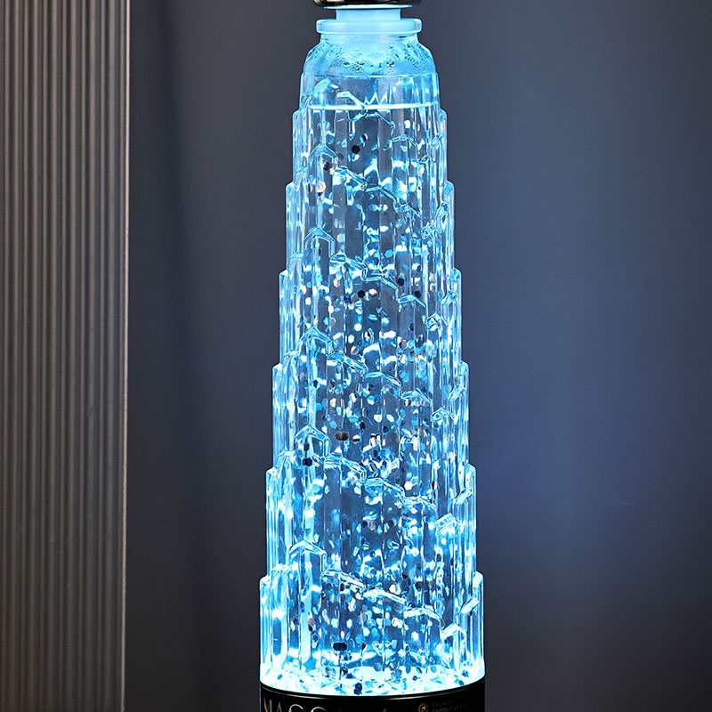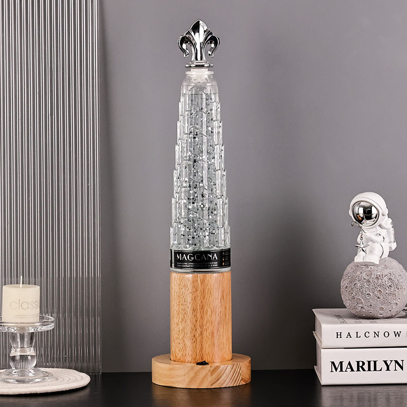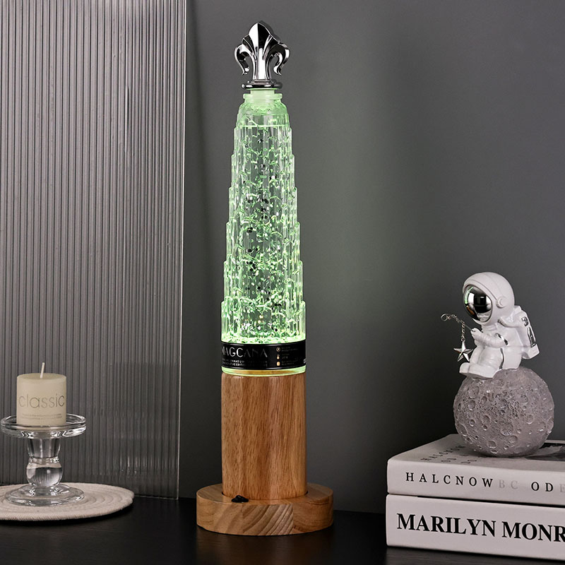 Lampu meja glitter iyub-iyub menara nganggo desain bentuk menara klasik, kanthi dekorasi logam sing apik banget ing sisih ndhuwur, prasaja nanging mulya. Botol kaca transparan ngemot cairan lan