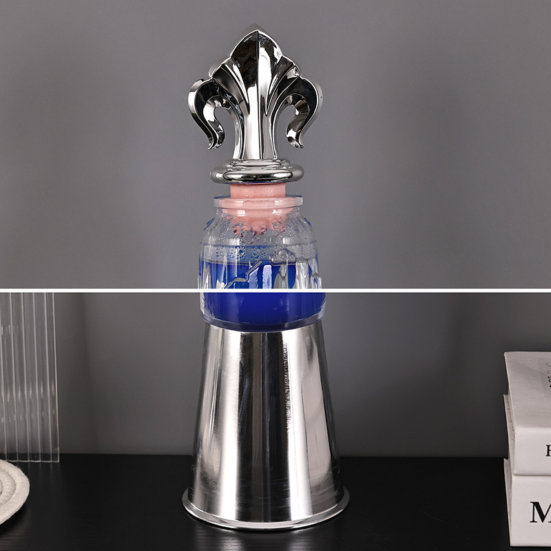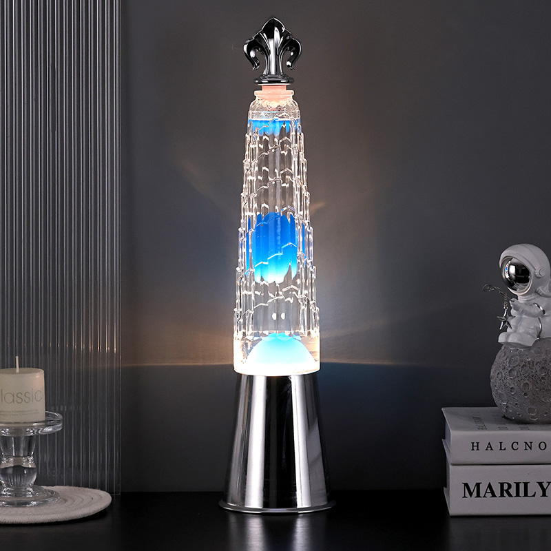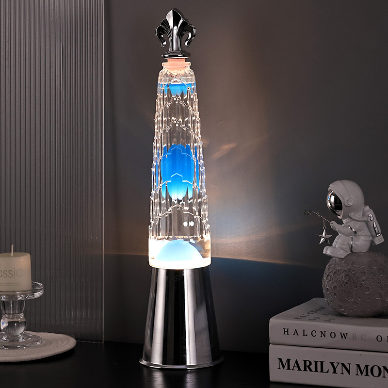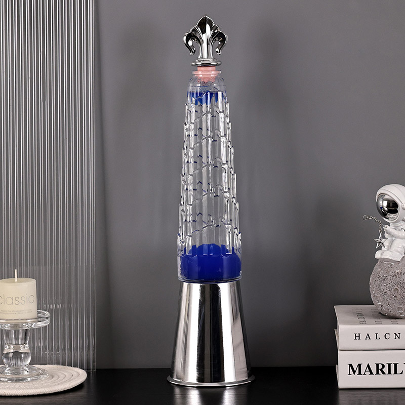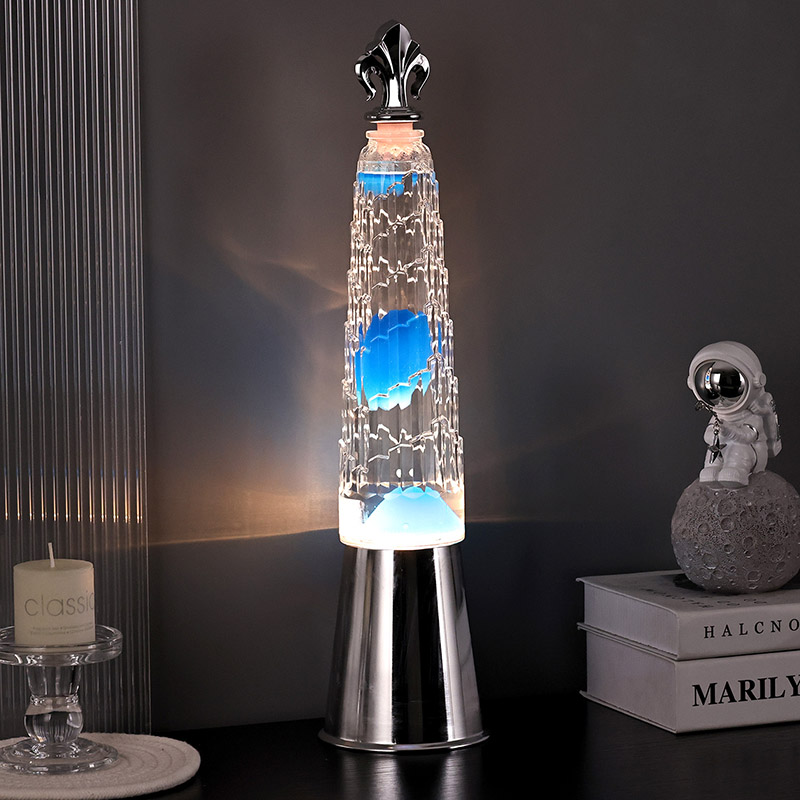 Lampu meja lampu lava iyub-iyub menara nduweni desain bentuk menara klasik, kanthi dekorasi logam ireng sing apik banget ing sisih ndhuwur, prasaja nanging mulya. Ing jero botol kaca transparan, ana lilin biru